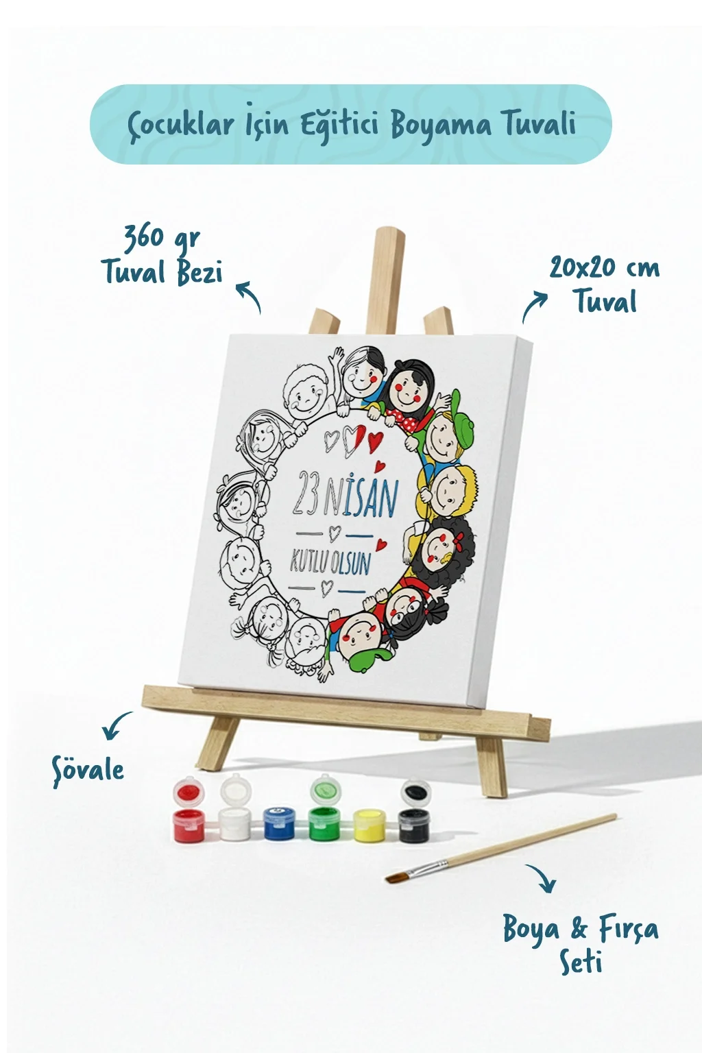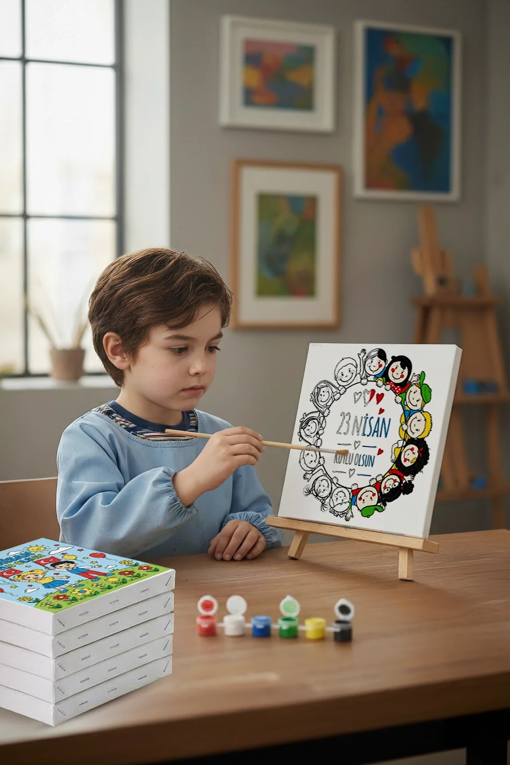 360 gr kaliteli tuval bezi ile üretilen dayanıklı yüzey, boyama sırasında rahat ve keyifli bir kullanım sağlar. Ortasında yer alan “23 Nisan Kutlu Olsun” mesajı ve etrafını saran çocuk figürleri sayesinde çocuklar hem eğlenir hem de özel günün anlamını keşfeder. Tamamlanan eser, mini şövale üzerinde sergilenerek kalıcı bir hatıraya dönüşür.