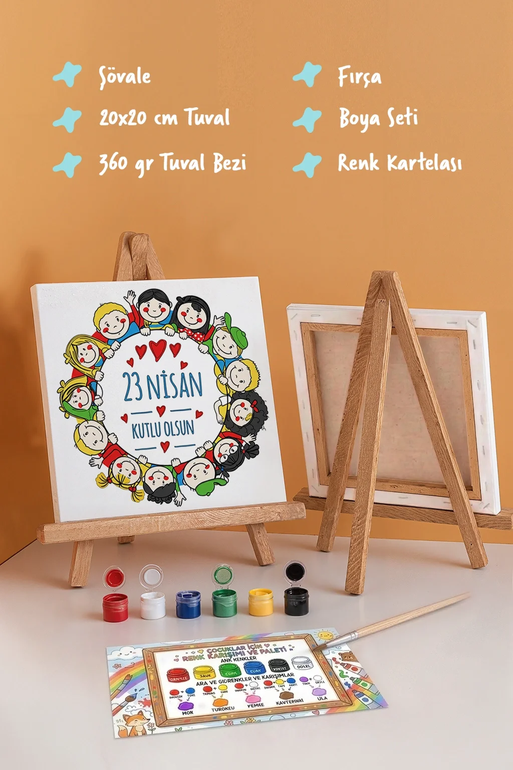 23 Nisan Çocuklar El Ele Temalı Boyama Tuvali – Şövaleli Boya Seti 20x20
