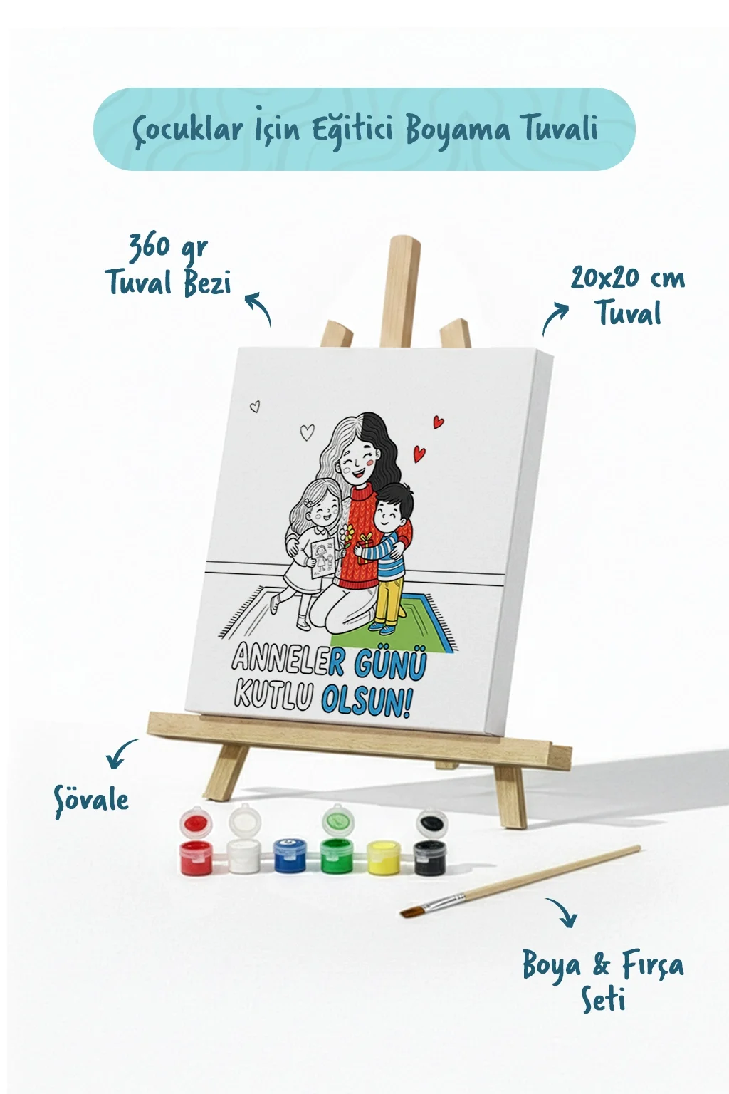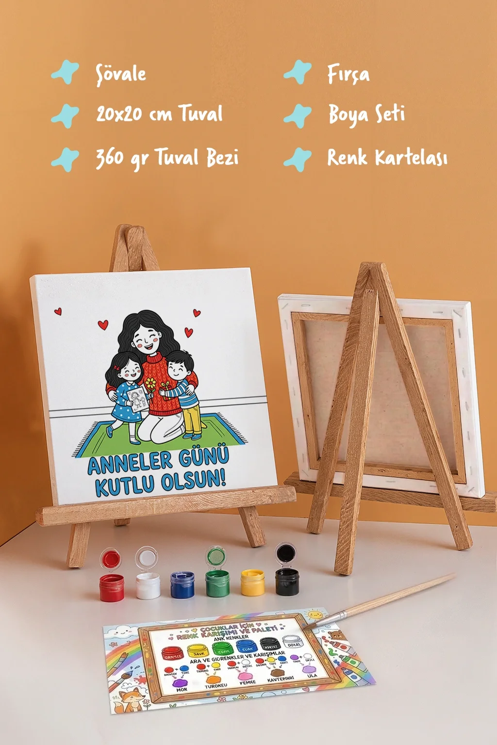 Anneler Günü Kutlu Olsun Boyama Tuvali Şövaleli Boya ve Fırça Seti 20x20 cm