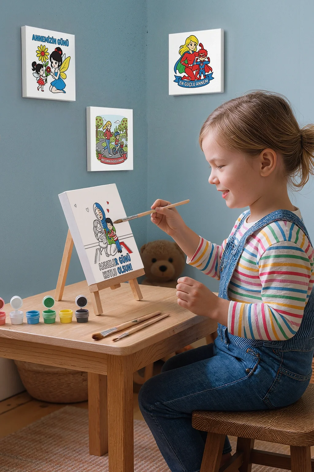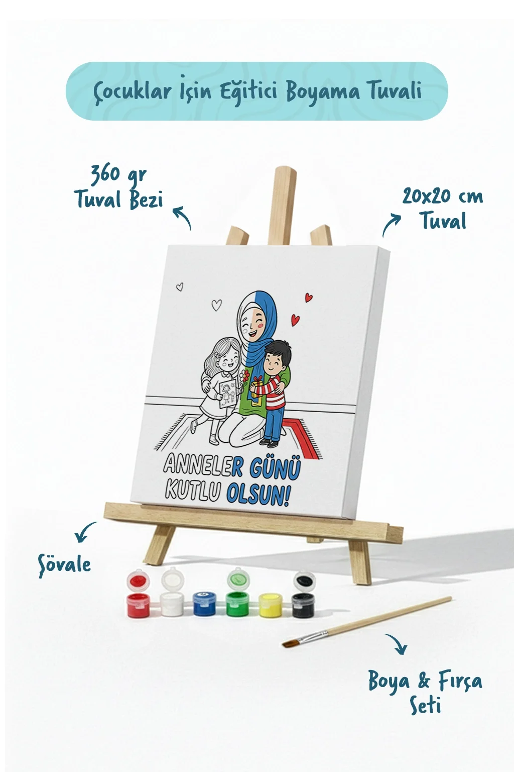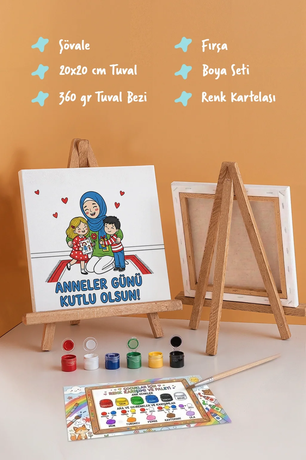 Anneler Günü Kutlu Olsun Yazılı Eğitici Boyama Tuvali Şövaleli Boya Seti 20x20 cm