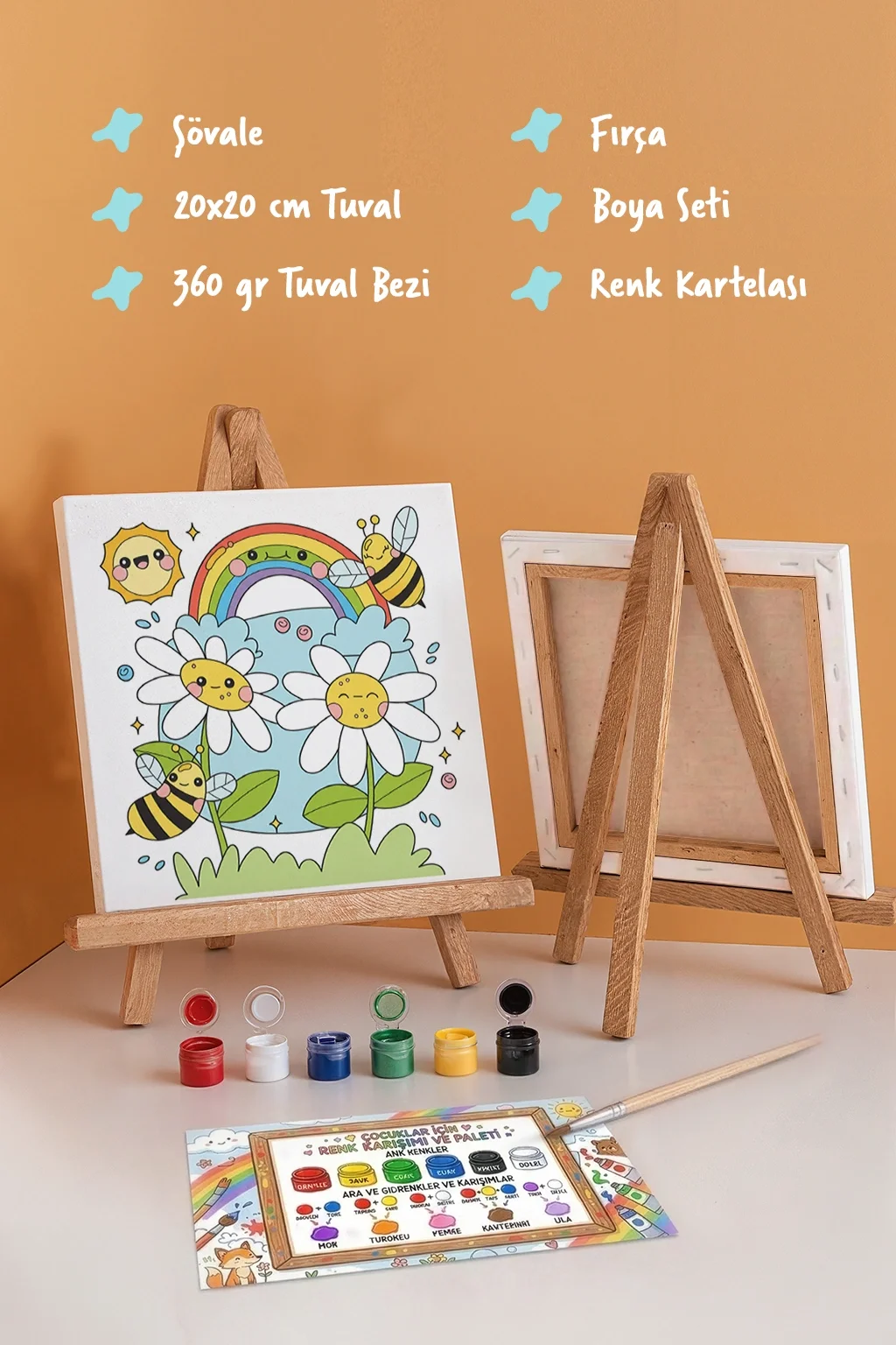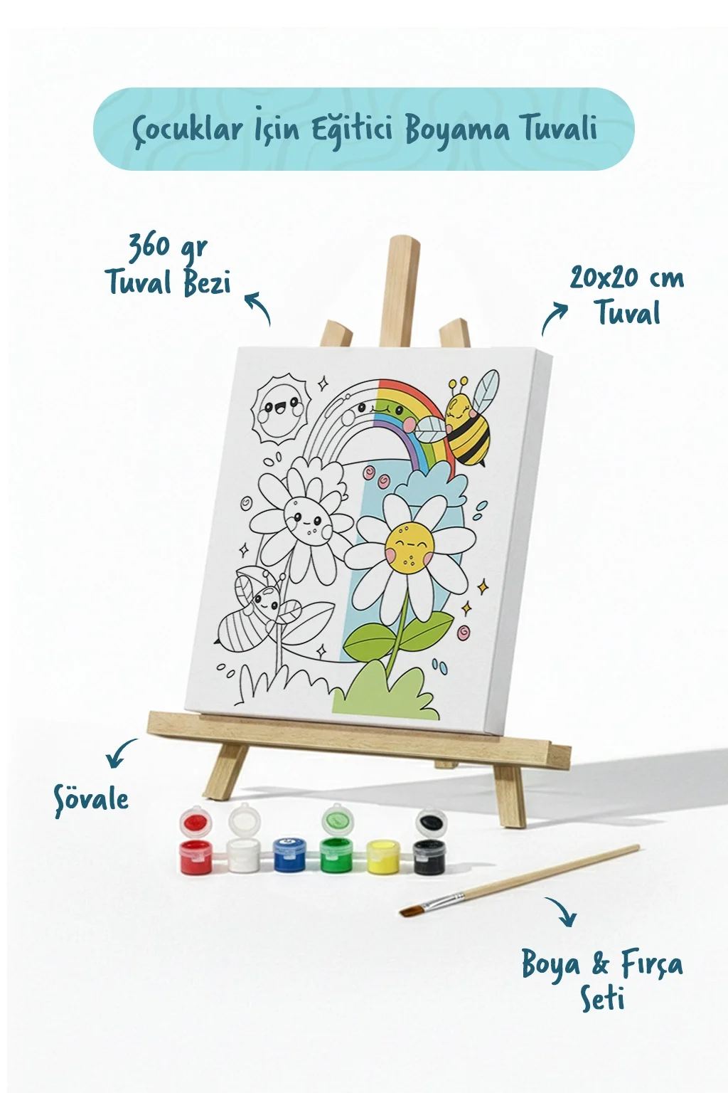 Arı & Gökkuşağı Figürlü Çocuk Boyama Tuvali – Şövaleli Boya Seti 20x20