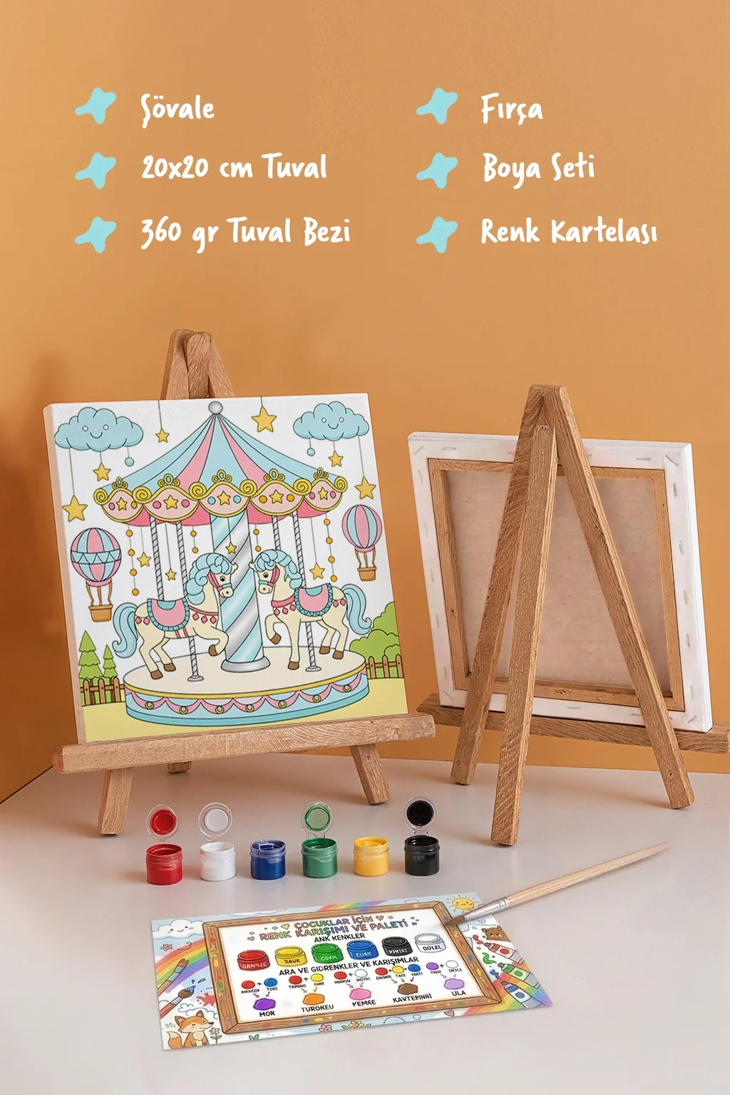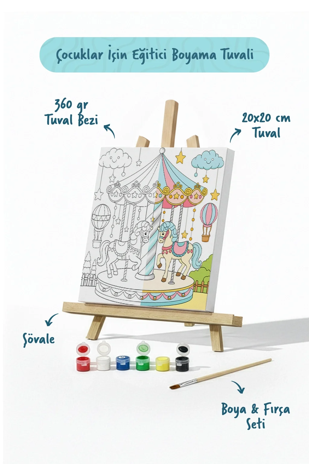 Çocukların yaratıcılığını geliştiren çocuk boyama tuvali, eğlenceli lunapark atmosferini yansıtan atlı karınca tasarımıyla keyifli bir boyama deneyimi sunar. Sevimli at figürleri, balonlar ve yıldızlarla süslenmiş bu sahne çocukların hayal gücünü harekete geçirir. 20x20 cm ölçülerindeki kaliteli pamuk tuval, mini ahşap şövale, boya seti ve fırça ile birlikte gelerek çocuklar için hem eğitici hem de eğlenceli bir aktivite sunar.