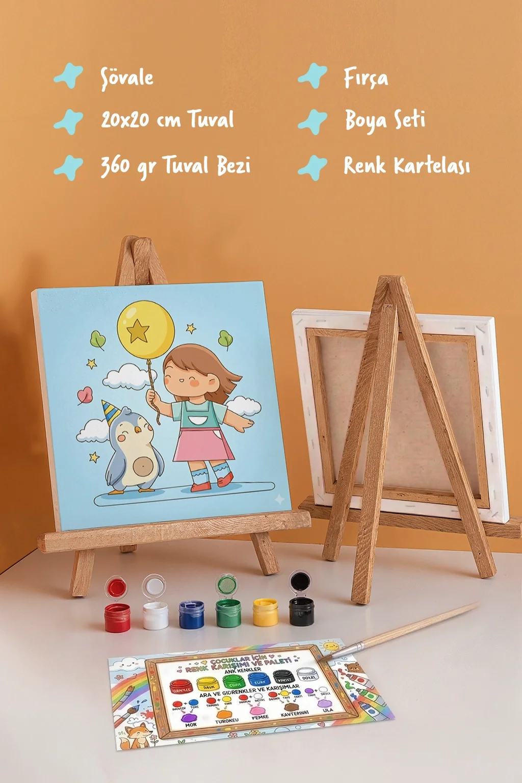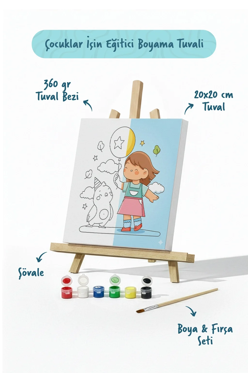 Balonlu Kız Figürlü Çocuk Boyama Tuvali – Şövaleli Boya Seti 20x20