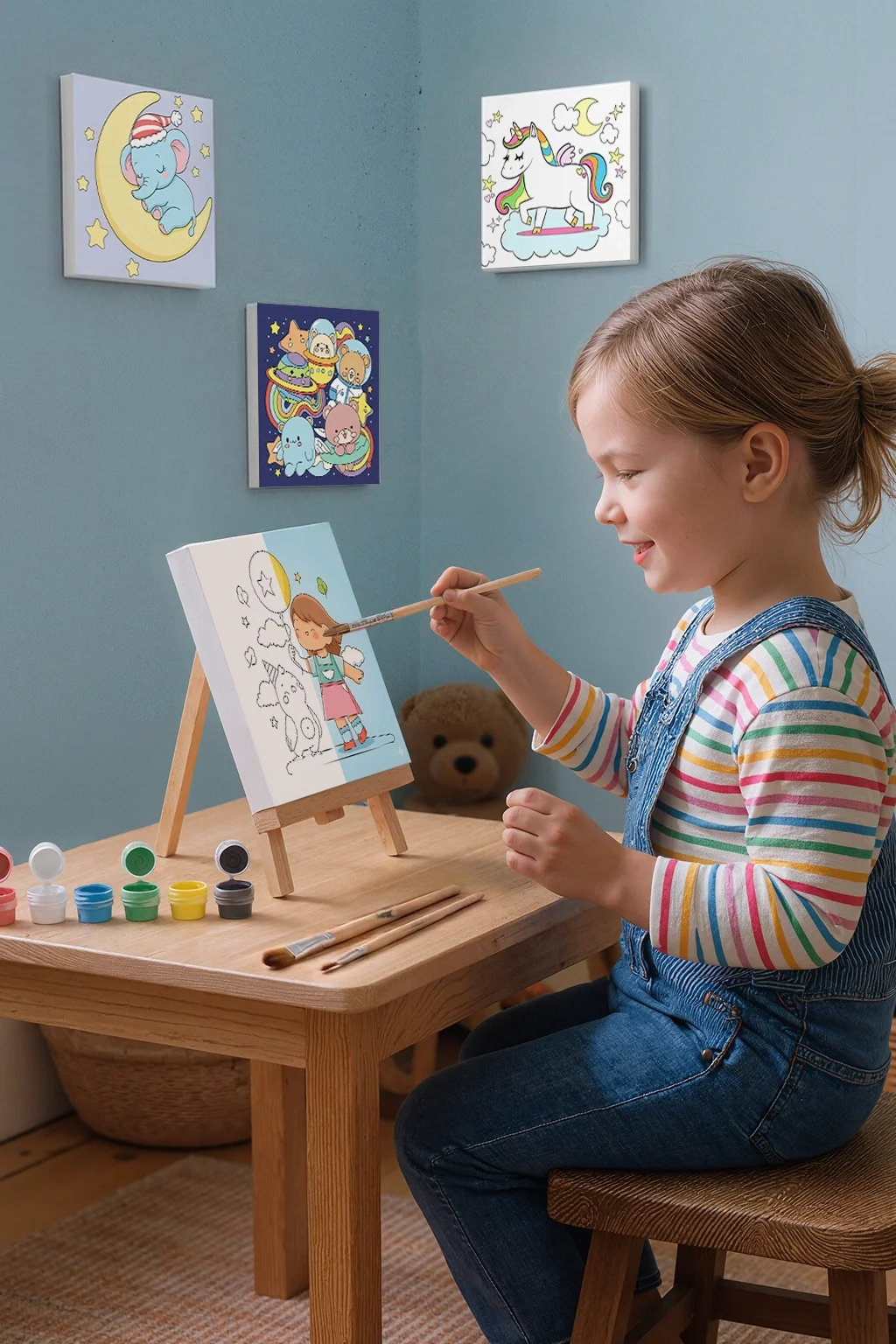 Şaseye gerilmiş pamuklu tuval yapısı sayesinde çocuklar gerçek bir tuval üzerinde boyama yapmanın keyfini yaşar. Tamamlanan eser, mini şövale üzerinde sergilenebilir ya da çocuk odasında dekoratif bir hatıra olarak saklanabilir.