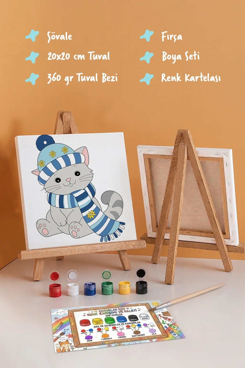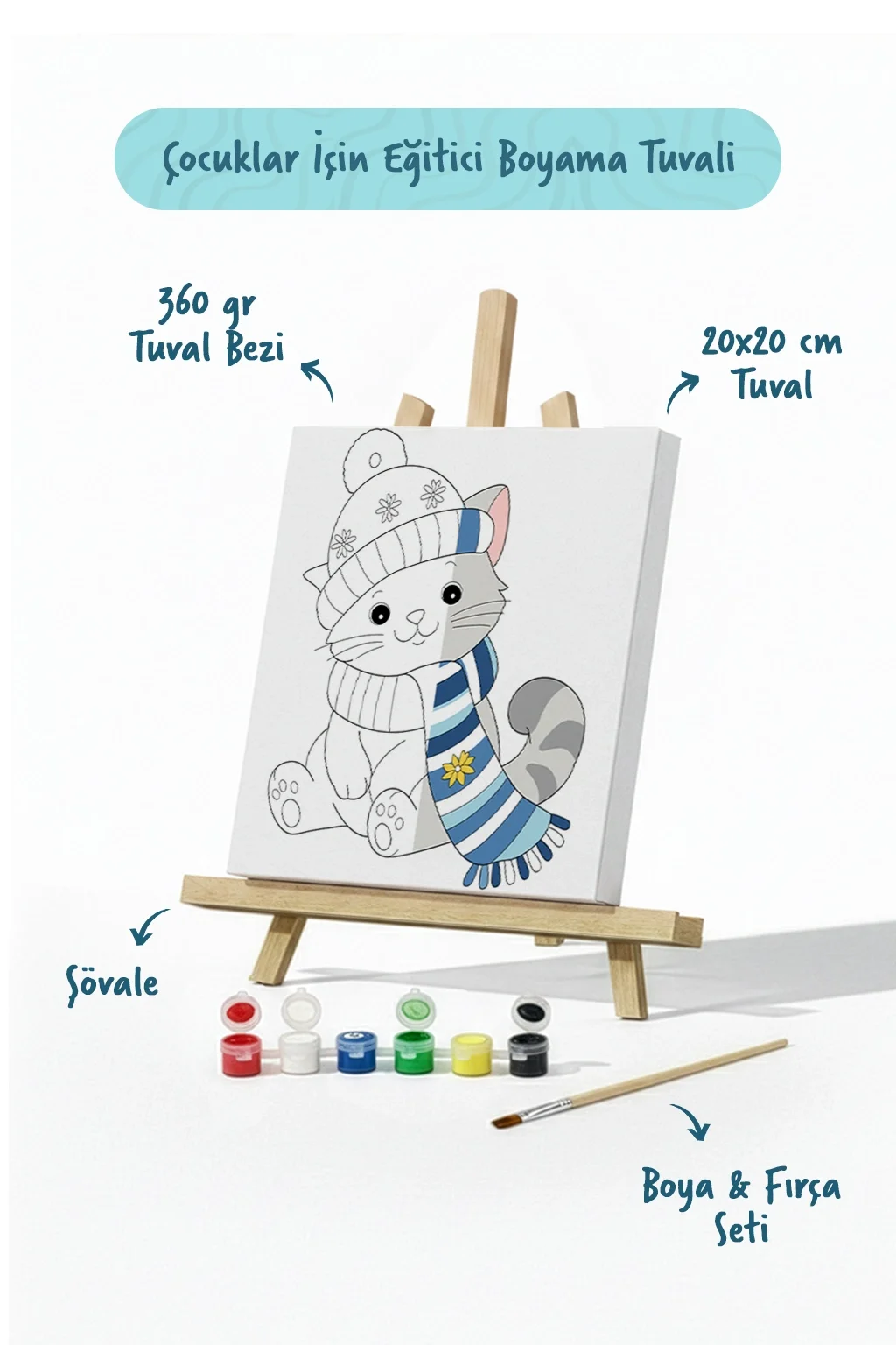 Bere ve Atkılı Sevimli Kedi Temalı Çocuk Boyama Tuvali – Şövaleli Eğitici Boyama Seti 20x20 cm