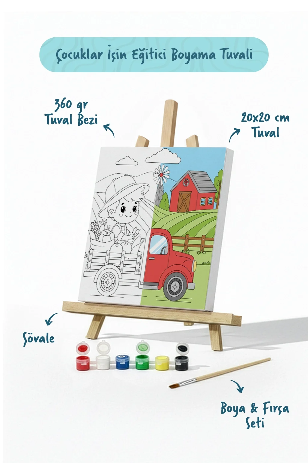 Çiftlik ve Kamyon Temalı Çocuk Boyama Tuvali – Şövaleli Eğitici Boyama Seti 20x20 cm