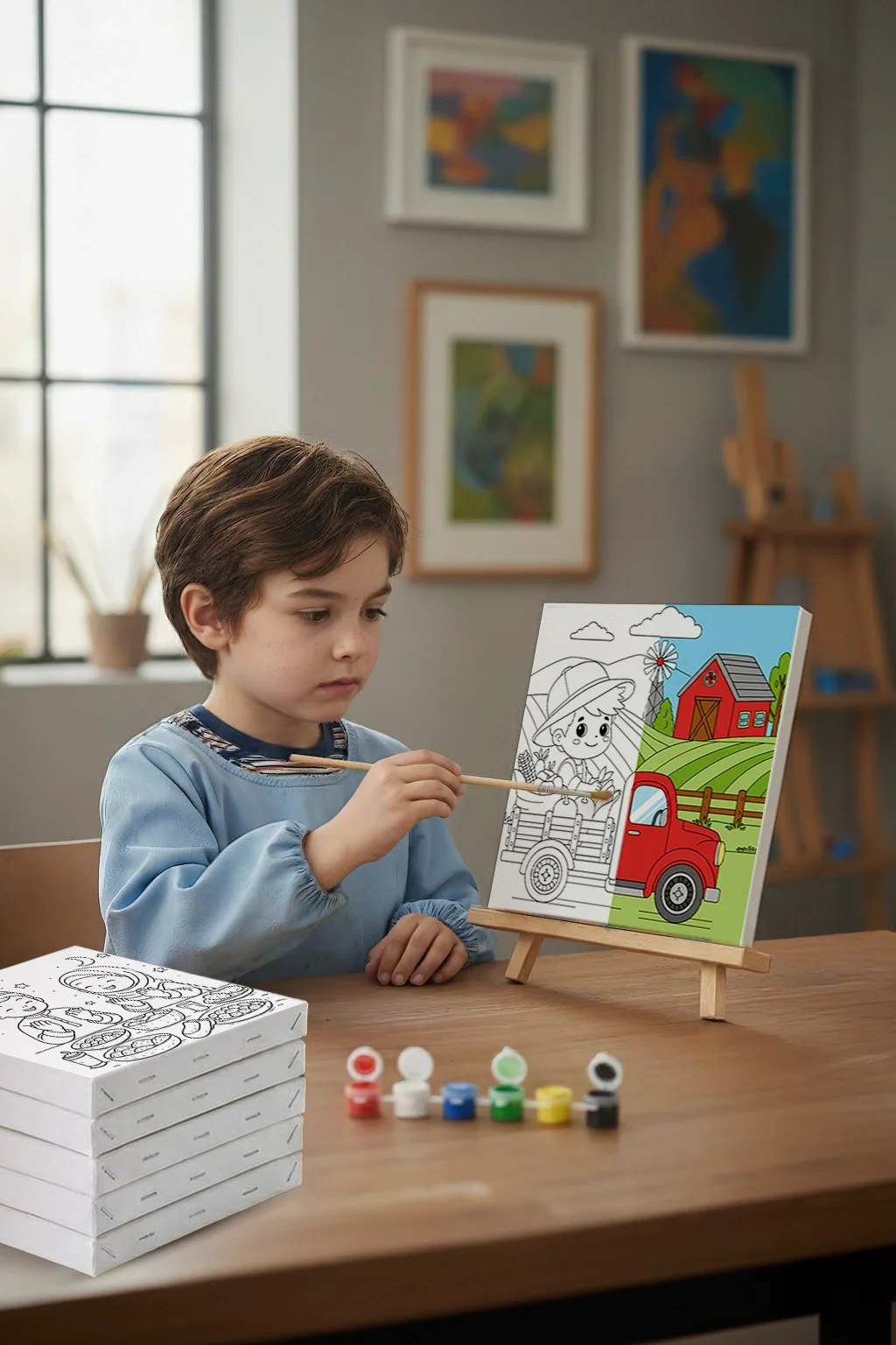 Tarlalar, rüzgar gülü, çiftlik evi ve ürün yüklü kamyon sahnesi, çocukların ilgisini çeken eğlenceli bir hikâye sunar. çocuklar için boyama tuvali, çocukların doğa ve çiftlik yaşamını keşfederken renklerle özgürce boyama yapmasına yardımcı olur.