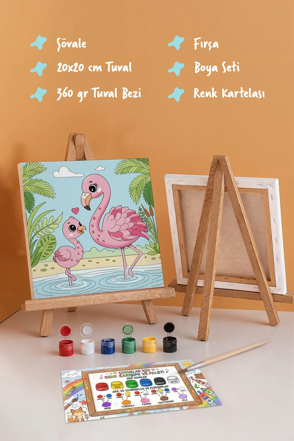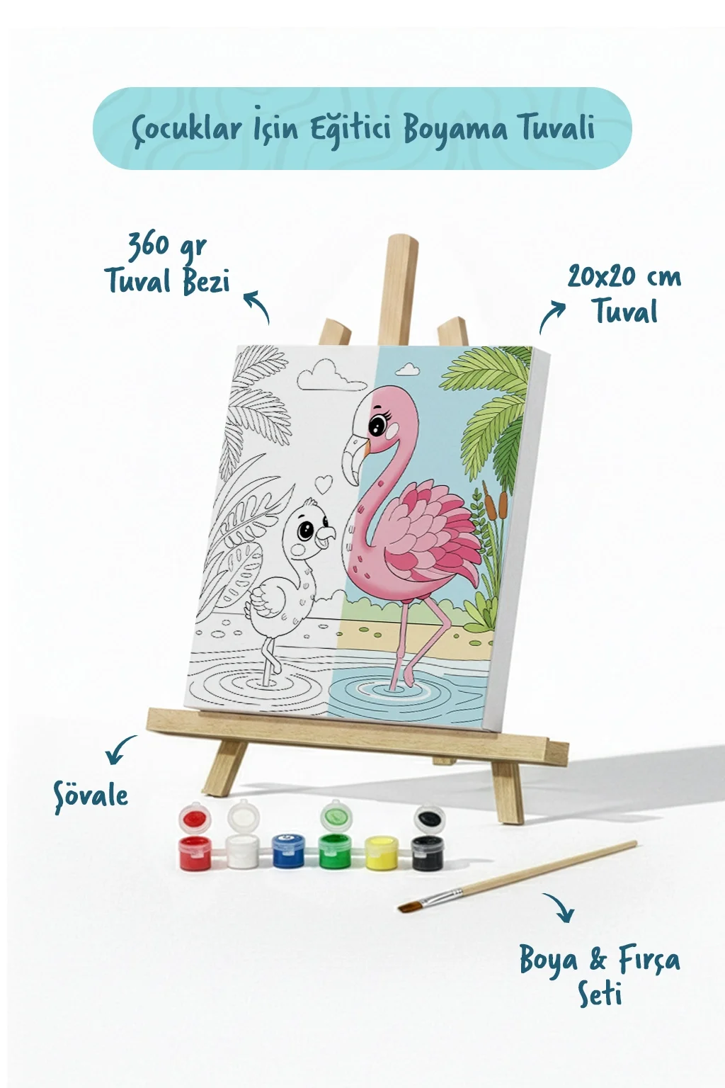 Flamingo Temalı Çocuk Boyama Tuvali – Şövaleli Eğitici Boyama Seti 20x20 cm