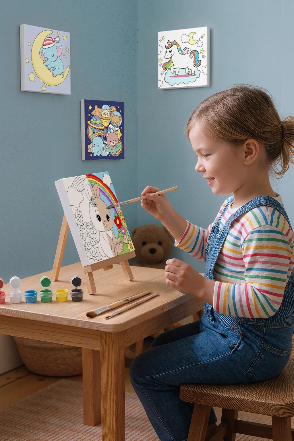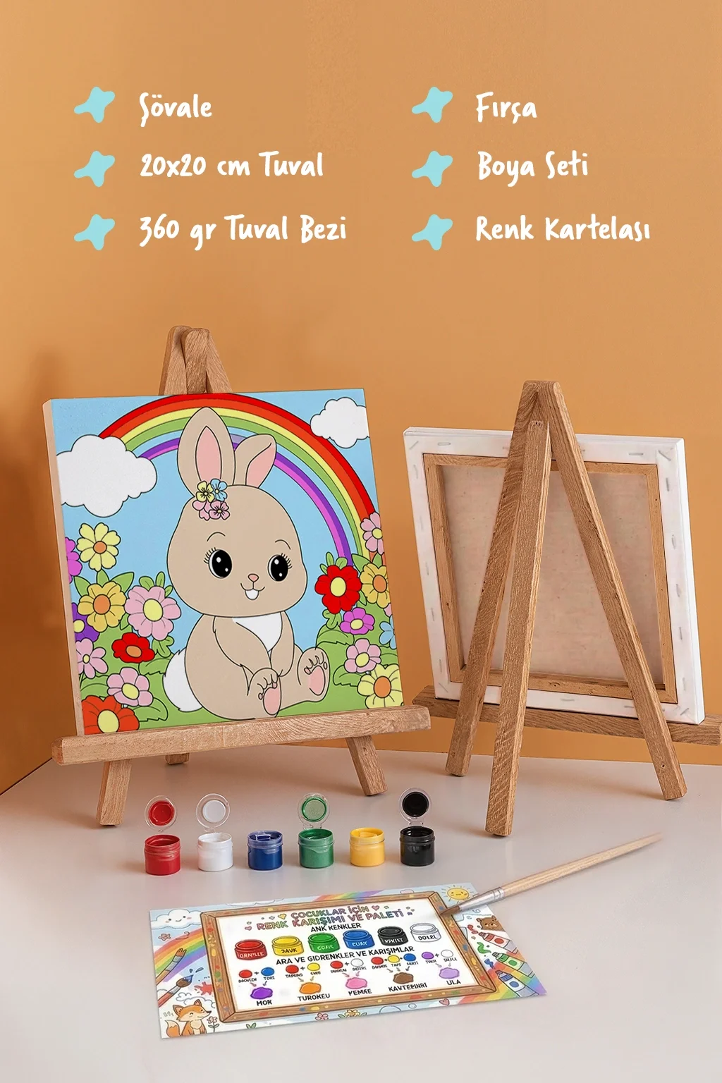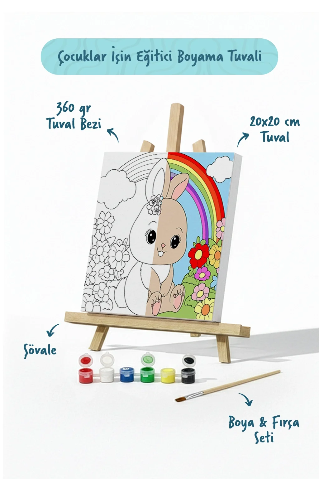 Gökkuşağı ve Tavşan Temalı Çocuk Boyama Tuvali – Şövaleli Eğitici Boyama Seti 20x20 cm