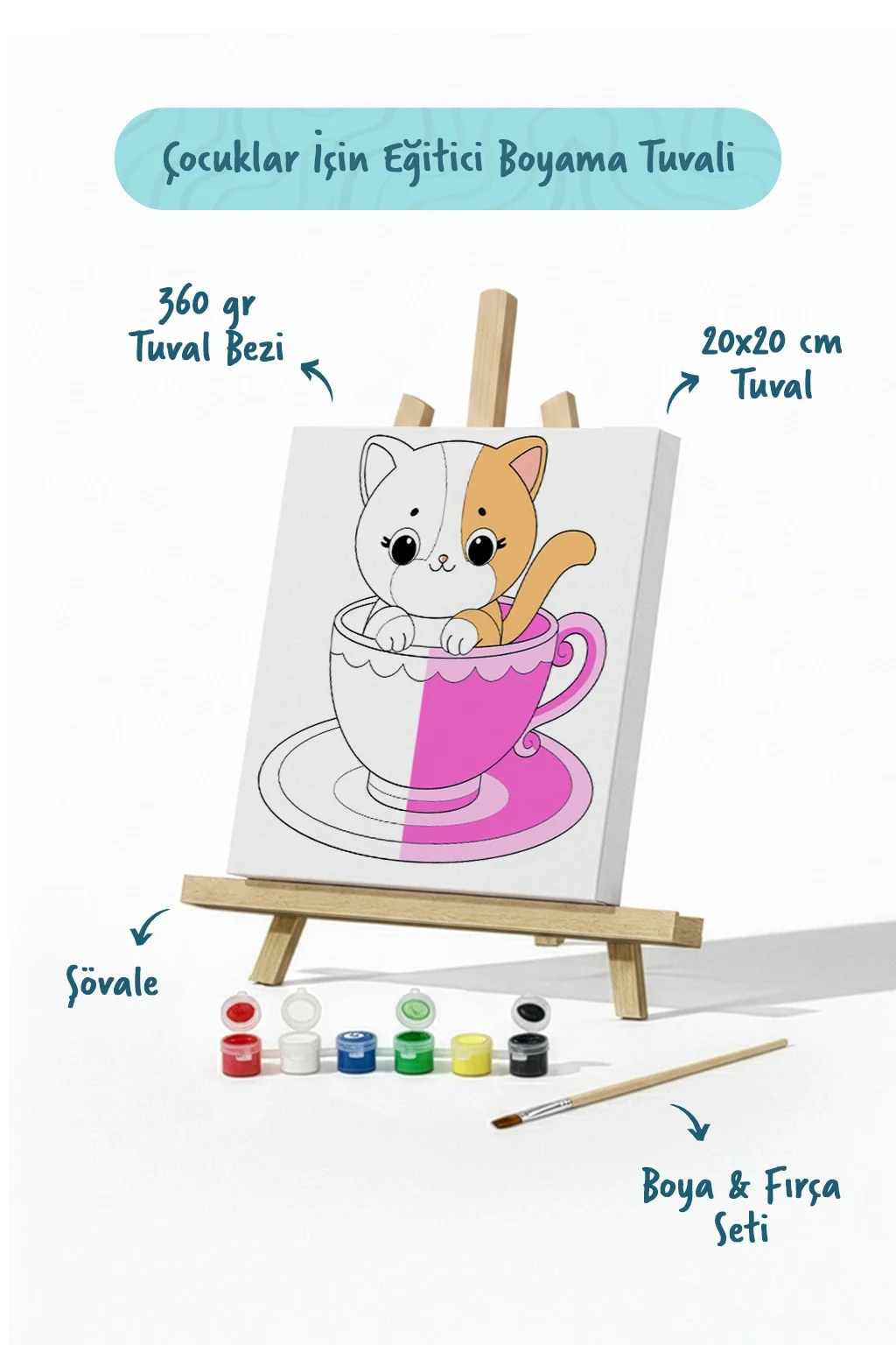 Kupa İçinde Sevimli Kedi Çocuk Boyama Tuvali – Şövaleli Boyama Seti 20x20 cm