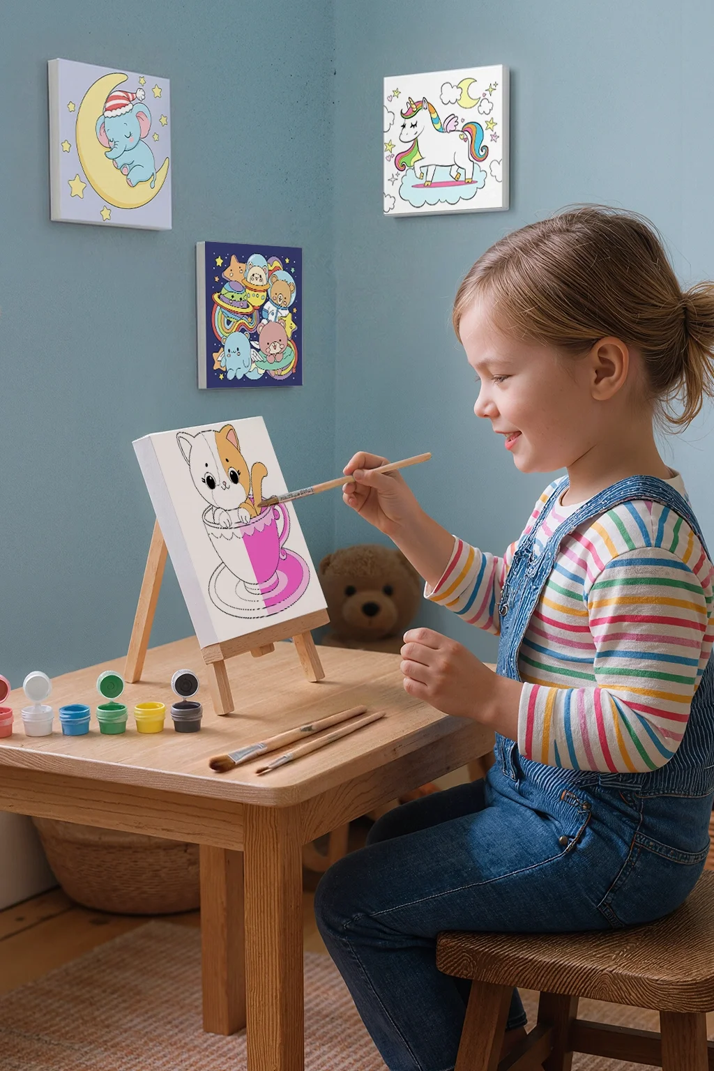 360 gram kaliteli tuval bezi sayesinde çocuklar gerçek bir sanat tuvali üzerinde boyama yapmanın keyfini yaşar. Boyama tamamlandığında ortaya çıkan eser mini şövale üzerinde sergilenebilir ve çocuk odası için dekoratif bir hatıra haline gelebilir.