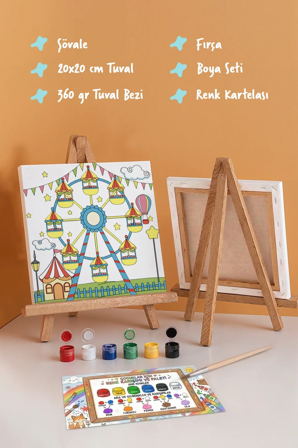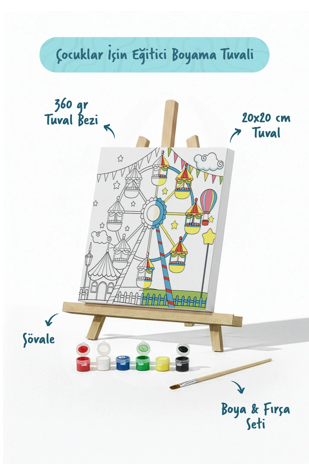Lunapark Dönme Dolap Temalı Çocuk Boyama Tuvali – Şövaleli Eğitici Boyama Seti 20x20 cm