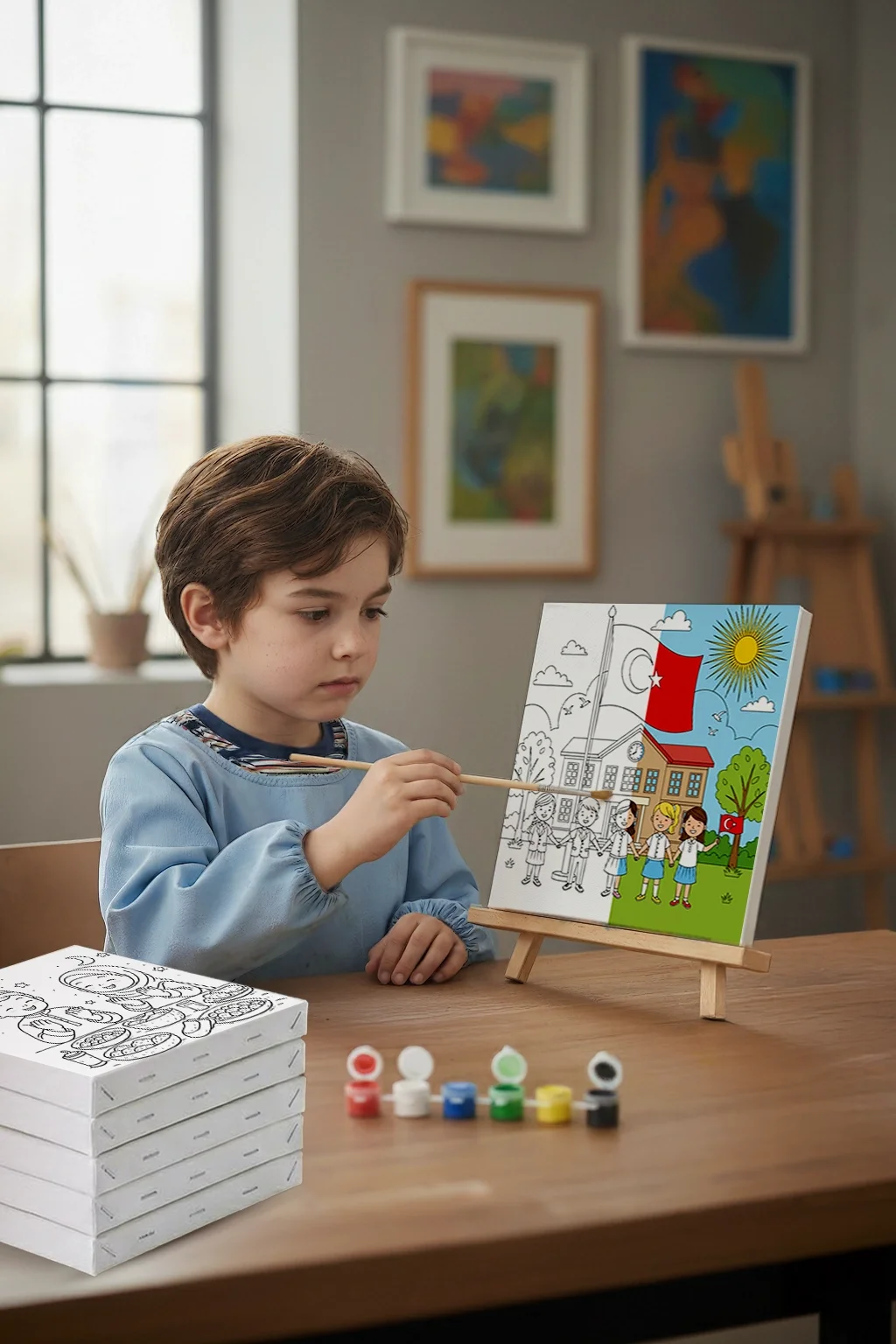 Çocukların hem yaratıcılığını hem de milli değerler bilincini destekleyen çocuk boyama tuvali, okul ve Türk bayrağı teması ile anlamlı bir boyama deneyimi sunar. Okul bahçesinde el ele tutuşan öğrenciler ve göndere çekilmiş Türk bayrağının yer aldığı bu özel tasarım, çocukların boyama yaparken keyifli bir sahneyi renklendirmesine yardımcı olur. 20x20 cm ölçülerindeki kaliteli pamuk tuval, mini ahşap şövale, boya seti ve fırça ile birlikte sunularak çocuklara gerçek bir ressam deneyimi yaşatır.