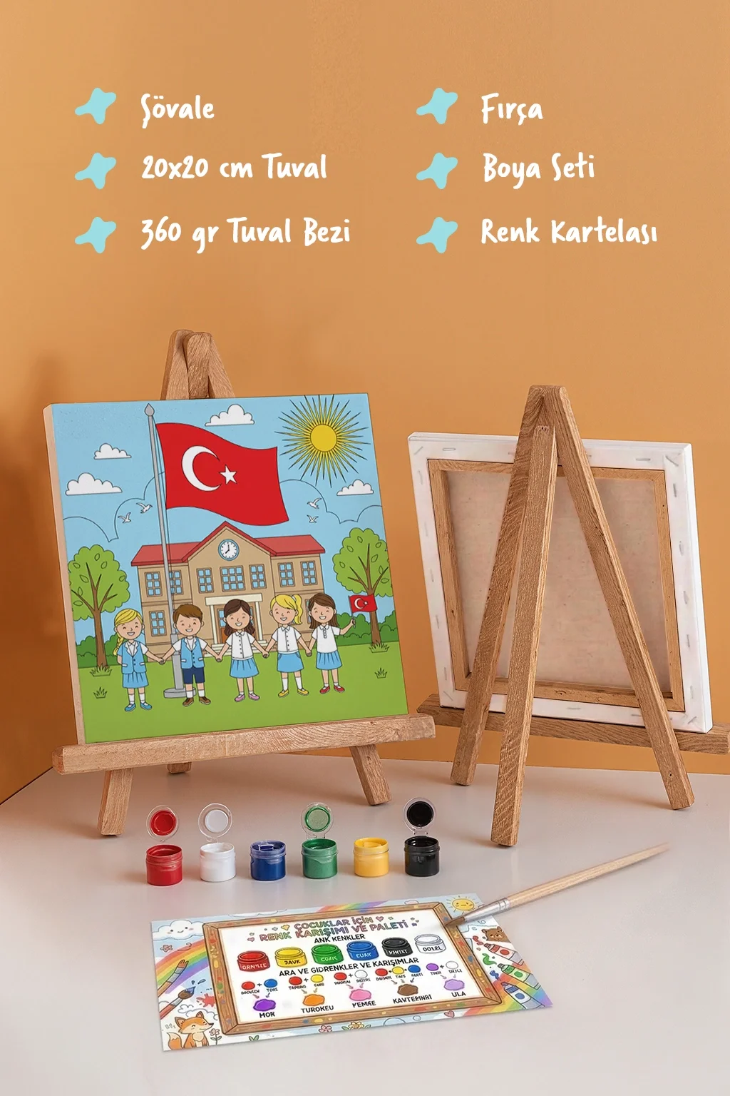 Okul ve Türk Bayrağı Temalı Çocuk Boyama Tuvali – Şövaleli Eğitici Boyama Seti 20x20 cm