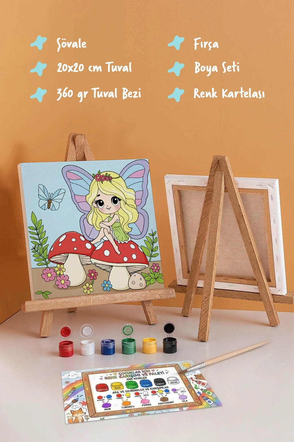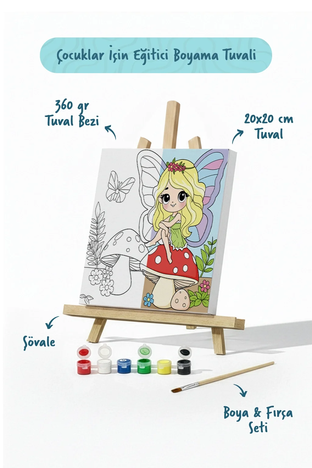Doğanın içinde mantar üzerinde oturan sevimli peri kızı tasarımı, çocukların ilgisini çeker ve boyama sürecini daha keyifli hale getirir. çocuklar için boyama tuvali, çocukların renkleri keşfetmesine, hayal gücünü kullanmasına ve eğlenceli bir sanat aktivitesi yapmasına yardımcı olur. Mini şövale sayesinde tuval sabit durur ve çocuklar rahat bir şekilde boyama yapabilir.