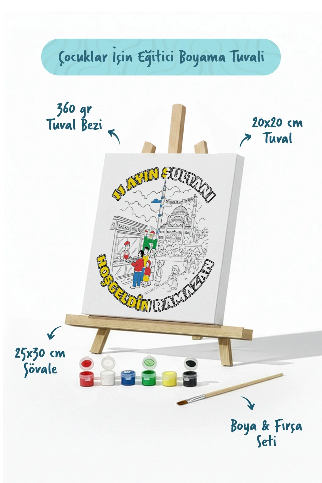 Şaseye gerilmiş pamuklu tuval yapısı sayesinde çocuklar gerçek bir tuval üzerinde boyama yapmanın keyfini yaşar. Tamamlanan eser, mini şövale üzerinde sergilenebilir ya da çocuk odasında dekoratif bir hatıra olarak saklanabilir.