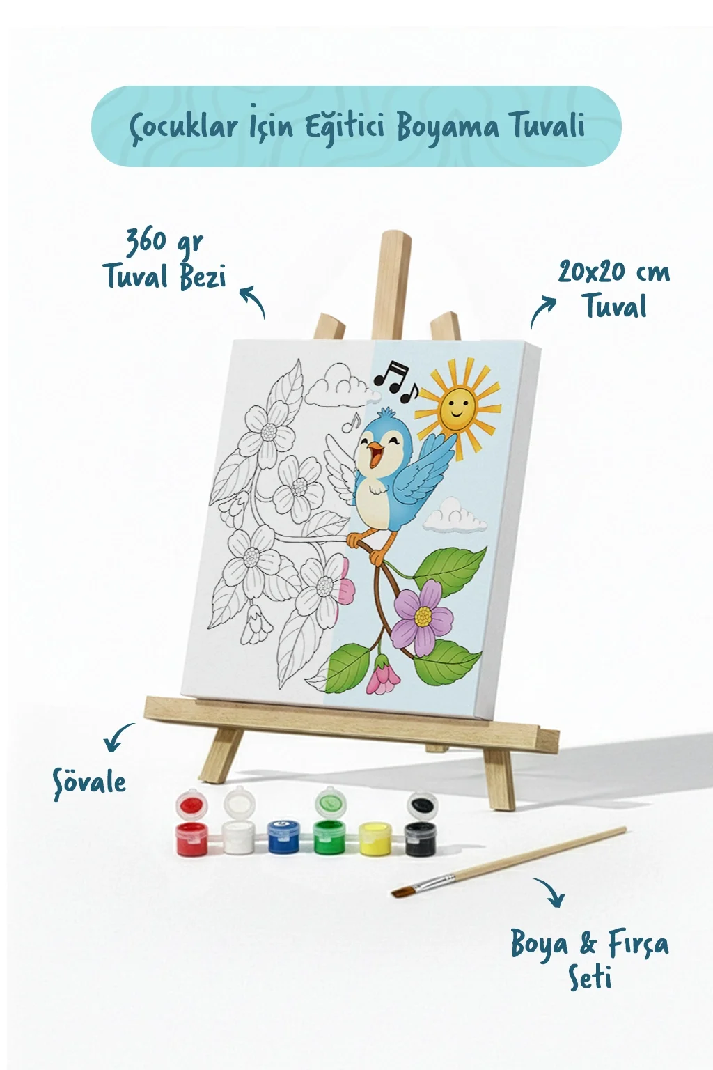 Çocukların yaratıcılığını ve hayal gücünü geliştirmek için tasarlanan çocuk boyama tuvali, dal üzerinde şarkı söyleyen sevimli kuş ve çiçek temalı çizimi ile eğlenceli bir sanat aktivitesi sunar. 20x20 cm ölçülerindeki kaliteli pamuk tuval, mini ahşap şövale, boya seti ve fırça ile birlikte sunularak çocukların gerçek bir ressam gibi boyama yapmasına olanak sağlar.