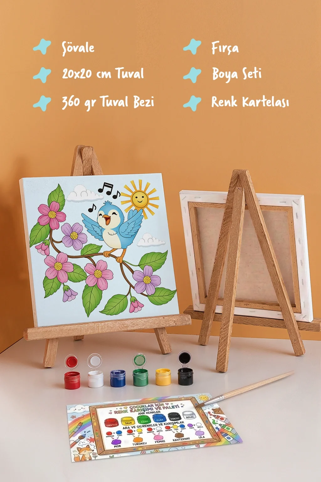 Şarkı Söyleyen Kuş Temalı Çocuk Boyama Tuvali – Şövaleli Eğitici Boyama Seti 20x20 cm