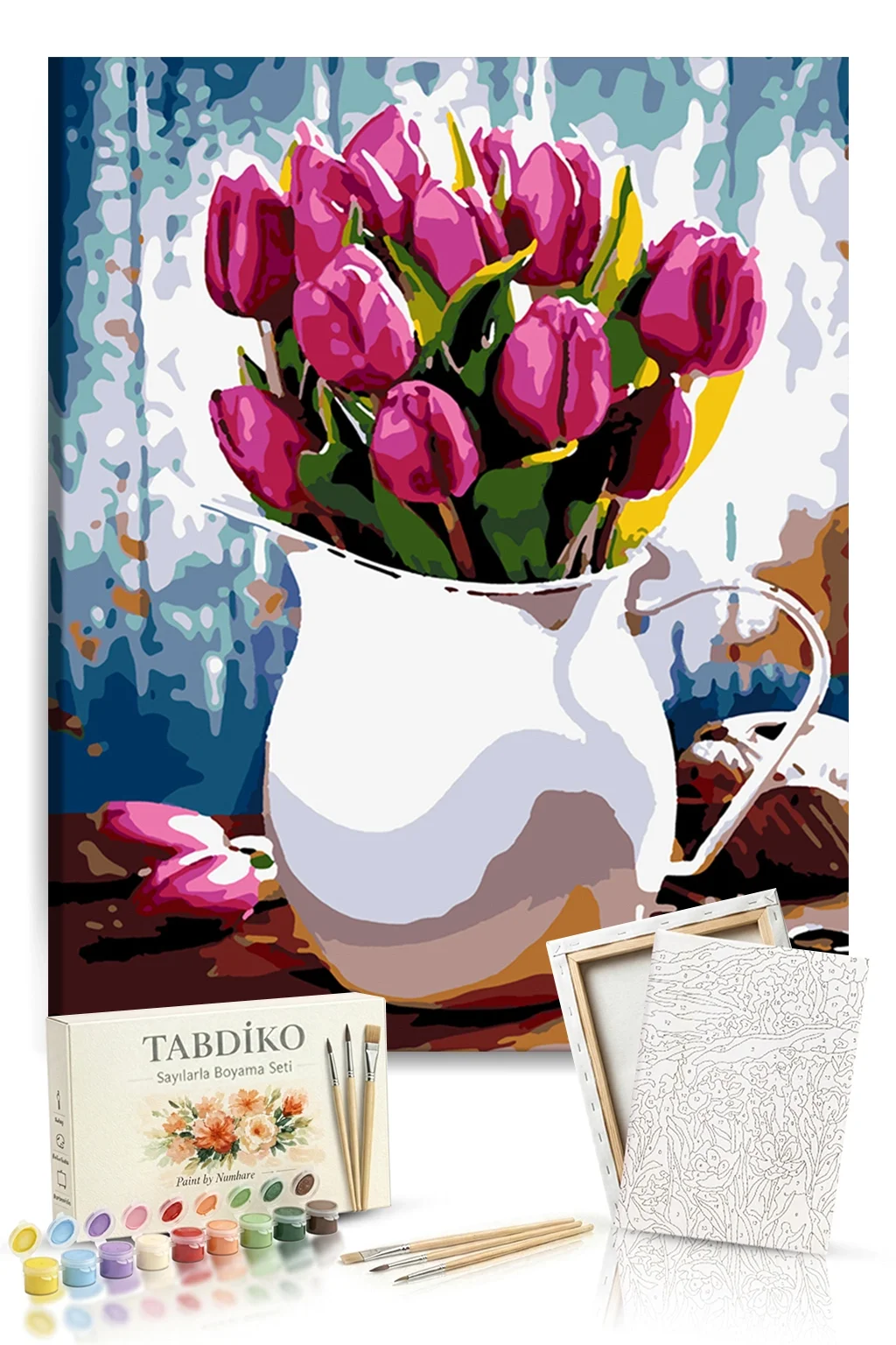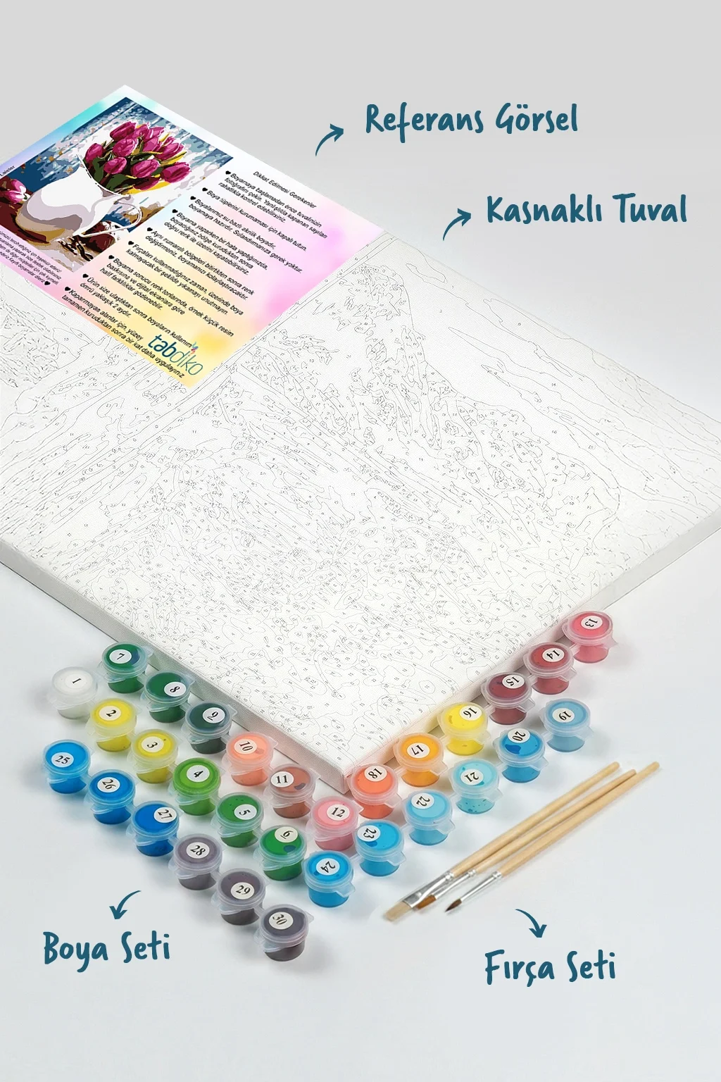Tuval üzerinde boyamaya hazır numaralı bölgeleri, uygun numaralı boyalar ile boyayarak kusursuz bir tablo meydana getirebilirsiniz. Sayılarla Boyama setimize başladığınızda, kendinizi profesyonel bir ressam gibi hissedeceksiniz. Sayılarla boyama setleri, resme yeni başlayanlar için mükemmel bir ilk adım olacaktır. Boyama setimiz ile temel resim becerilerini kazanmış ve başarı duygusunu tatmış olacaksınız. Bitmiş tablonuzu dilerseniz evinizin en güzel köşesine asabilirsiniz. Sevdiklerinizle ya da çocuklarınızla keyifli ve kaliteli vakit geçirmek için sizler de Tabdiko ailesine katılın, bu eşsiz boyama zevkinin tadına varın. 100'lerce farklı tablo modeline mağazamızdan erişebilirsiniz. Görmekte olduğunuz renkler, gerçek renk tonlarına en yakın olacak şekilde seçilmiştir. Ancak, referans baskılarına ya da bilgisayar/tablet/akıllı telefon ekran ayarlarına göre renk tonlarında hafif farklılıklar gözlemlenebilir. Her yaştan insanı adeta birer amatör ressama dönüştüren Numaralarla boyama seti ile, ister duvarlarınızı süsleyen harika tablolar yaratabilir isterseniz de sevdiklerinize özel ve anlamlı bu armağanı sunabilirsiniz…