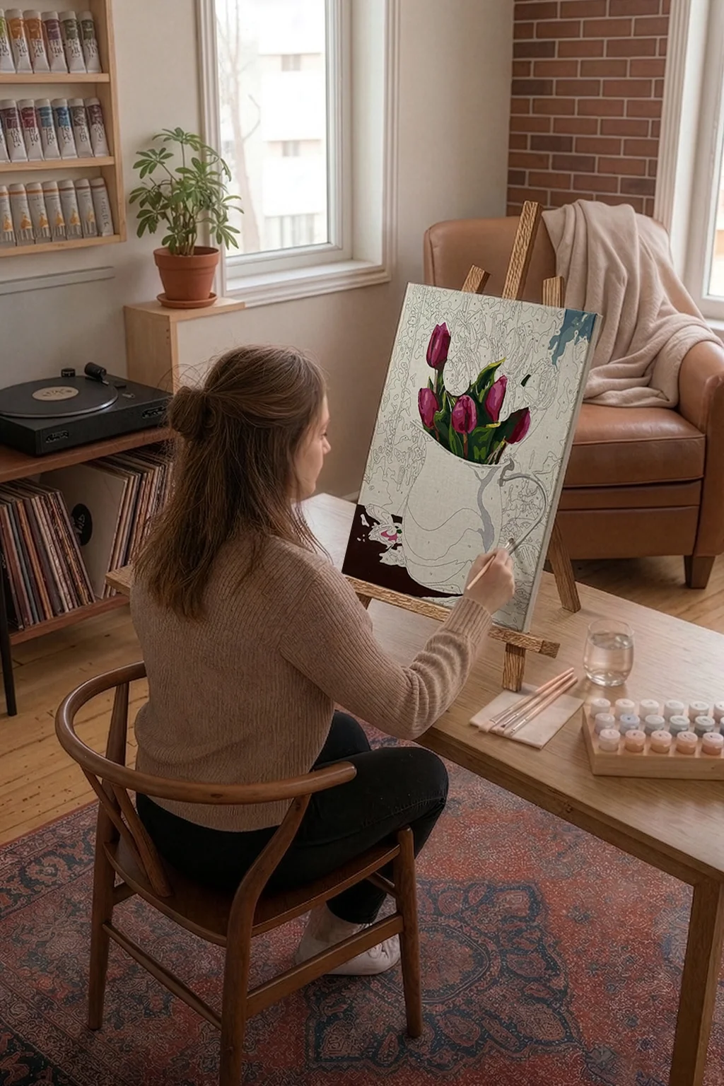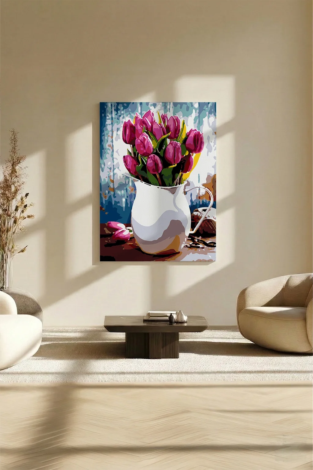Sayılarla Boyama Seti 40 x 50 cm Tuval Şasesine Gerili Beyaz Vazodaki Kırmızı Laleler