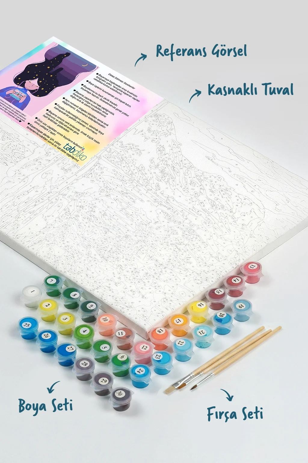 Tuval üzerinde boyamaya hazır numaralı bölgeleri, uygun numaralı boyalar ile boyayarak kusursuz bir tablo meydana getirebilirsiniz. Sayılarla Boyama setimize başladığınızda, kendinizi profesyonel bir ressam gibi hissedeceksiniz. Sayılarla boyama setleri, resme yeni başlayanlar için mükemmel bir ilk adım olacaktır. Boyama setimiz ile temel resim becerilerini kazanmış ve başarı duygusunu tatmış olacaksınız. Bitmiş tablonuzu dilerseniz evinizin en güzel köşesine asabilirsiniz. Sevdiklerinizle ya da çocuklarınızla keyifli ve kaliteli vakit geçirmek için sizler de Tabdiko ailesine katılın, bu eşsiz boyama zevkinin tadına varın. 100'lerce farklı tablo modeline mağazamızdan erişebilirsiniz. Görmekte olduğunuz renkler, gerçek renk tonlarına en yakın olacak şekilde seçilmiştir. Ancak, referans baskılarına ya da bilgisayar/tablet/akıllı telefon ekran ayarlarına göre renk tonlarında hafif farklılıklar gözlemlenebilir. Her yaştan insanı adeta birer amatör ressama dönüştüren Numaralarla boyama seti ile, ister duvarlarınızı süsleyen harika tablolar yaratabilir isterseniz de sevdiklerinize özel ve anlamlı bu armağanı sunabilirsiniz…