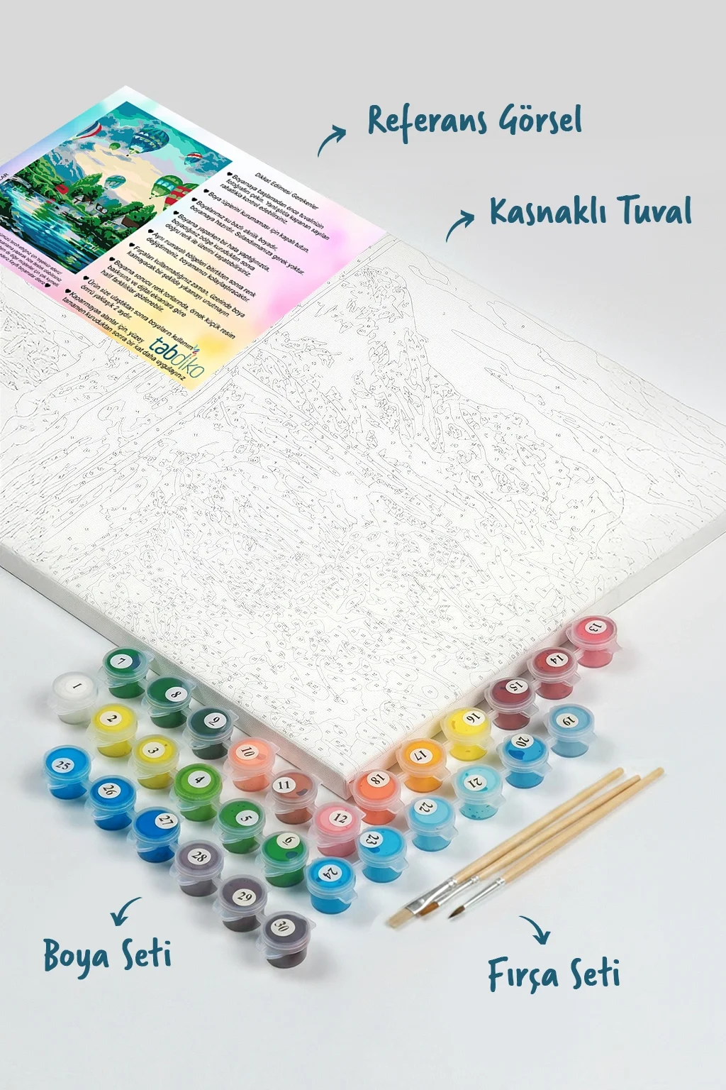 Tuval üzerinde boyamaya hazır numaralı bölgeleri, uygun numaralı boyalar ile boyayarak kusursuz bir tablo meydana getirebilirsiniz. Sayılarla Boyama setimize başladığınızda, kendinizi profesyonel bir ressam gibi hissedeceksiniz. Sayılarla boyama setleri, resme yeni başlayanlar için mükemmel bir ilk adım olacaktır. Boyama setimiz ile temel resim becerilerini kazanmış ve başarı duygusunu tatmış olacaksınız. Bitmiş tablonuzu dilerseniz evinizin en güzel köşesine asabilirsiniz. Sevdiklerinizle ya da çocuklarınızla keyifli ve kaliteli vakit geçirmek için sizler de Tabdiko ailesine katılın, bu eşsiz boyama zevkinin tadına varın. 100'lerce farklı tablo modeline mağazamızdan erişebilirsiniz. Görmekte olduğunuz renkler, gerçek renk tonlarına en yakın olacak şekilde seçilmiştir. Ancak, referans baskılarına ya da bilgisayar/tablet/akıllı telefon ekran ayarlarına göre renk tonlarında hafif farklılıklar gözlemlenebilir. Her yaştan insanı adeta birer amatör ressama dönüştüren Numaralarla boyama seti ile, ister duvarlarınızı süsleyen harika tablolar yaratabilir isterseniz de sevdiklerinize özel ve anlamlı bu armağanı sunabilirsiniz…
