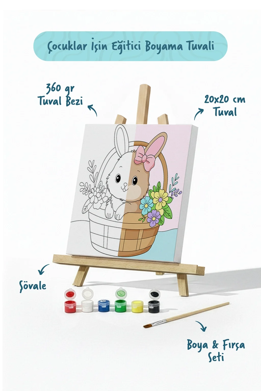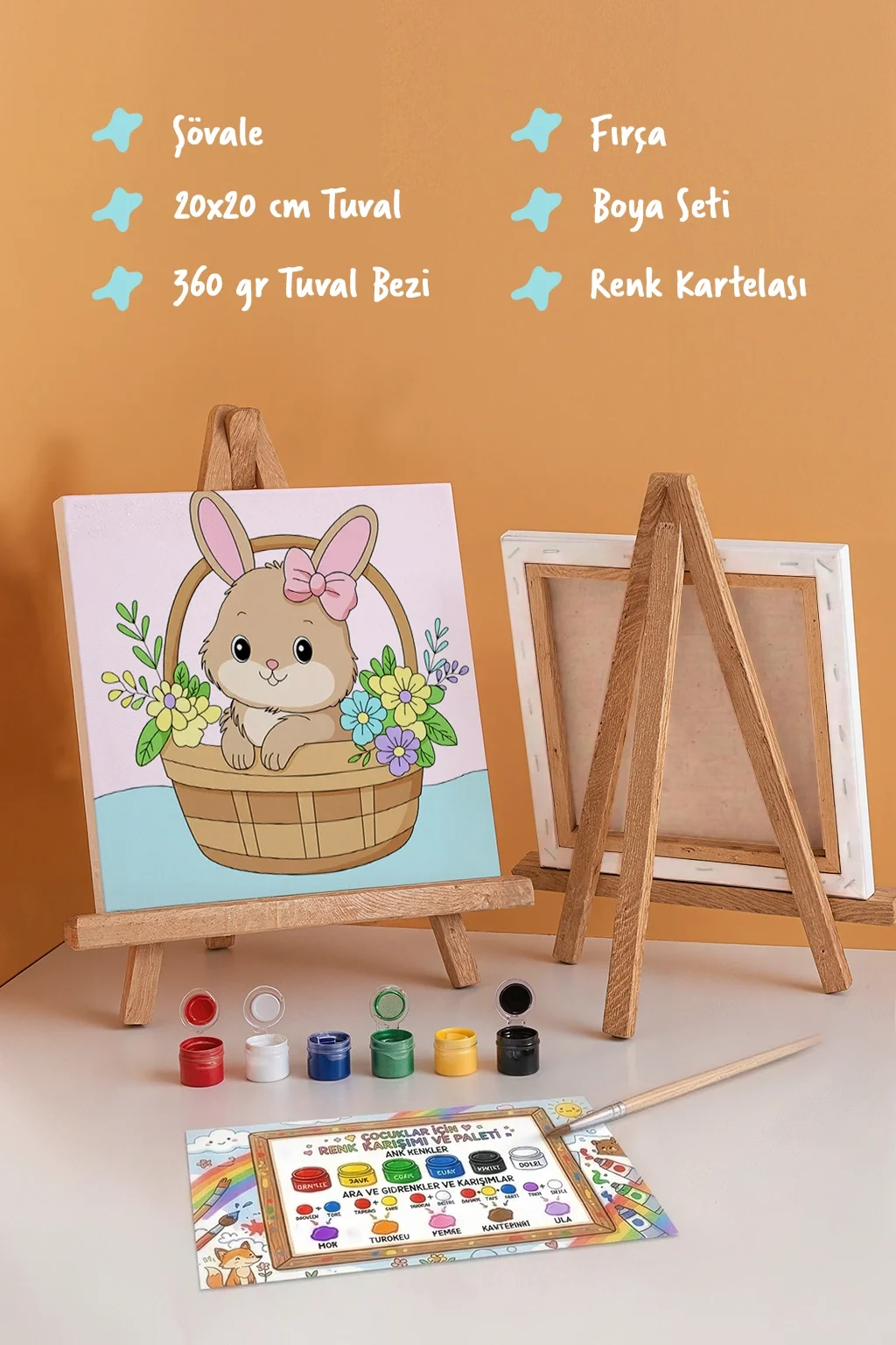 Sepette Tavşan Temalı Çocuk Boyama Tuvali – Şövaleli Eğitici Boyama Seti 20x20 cm