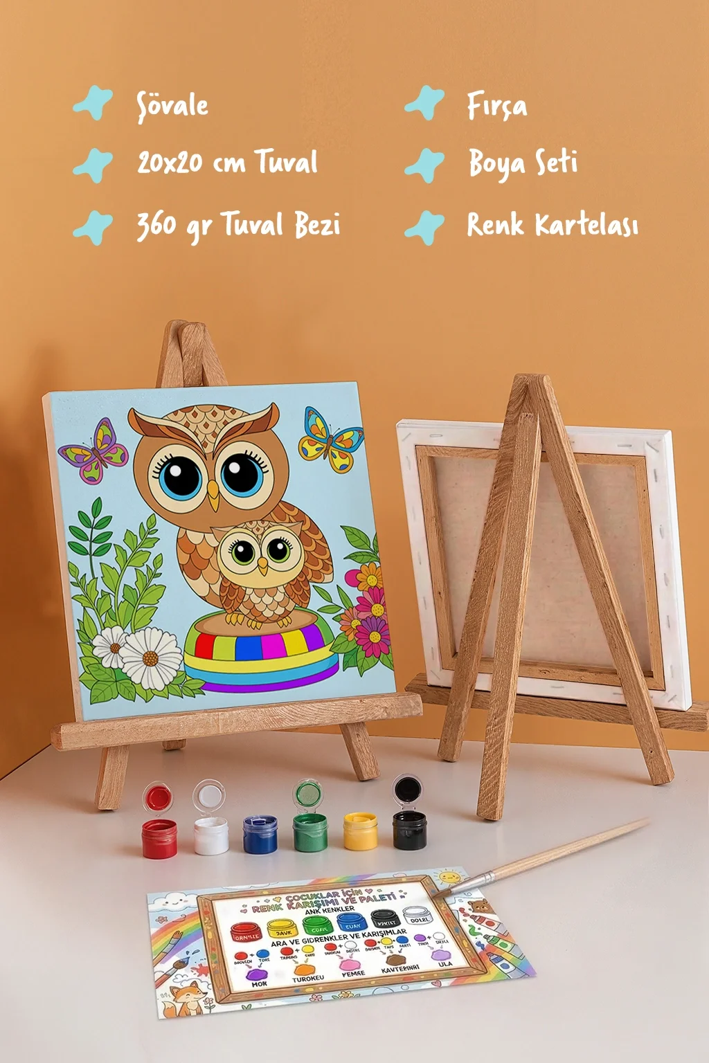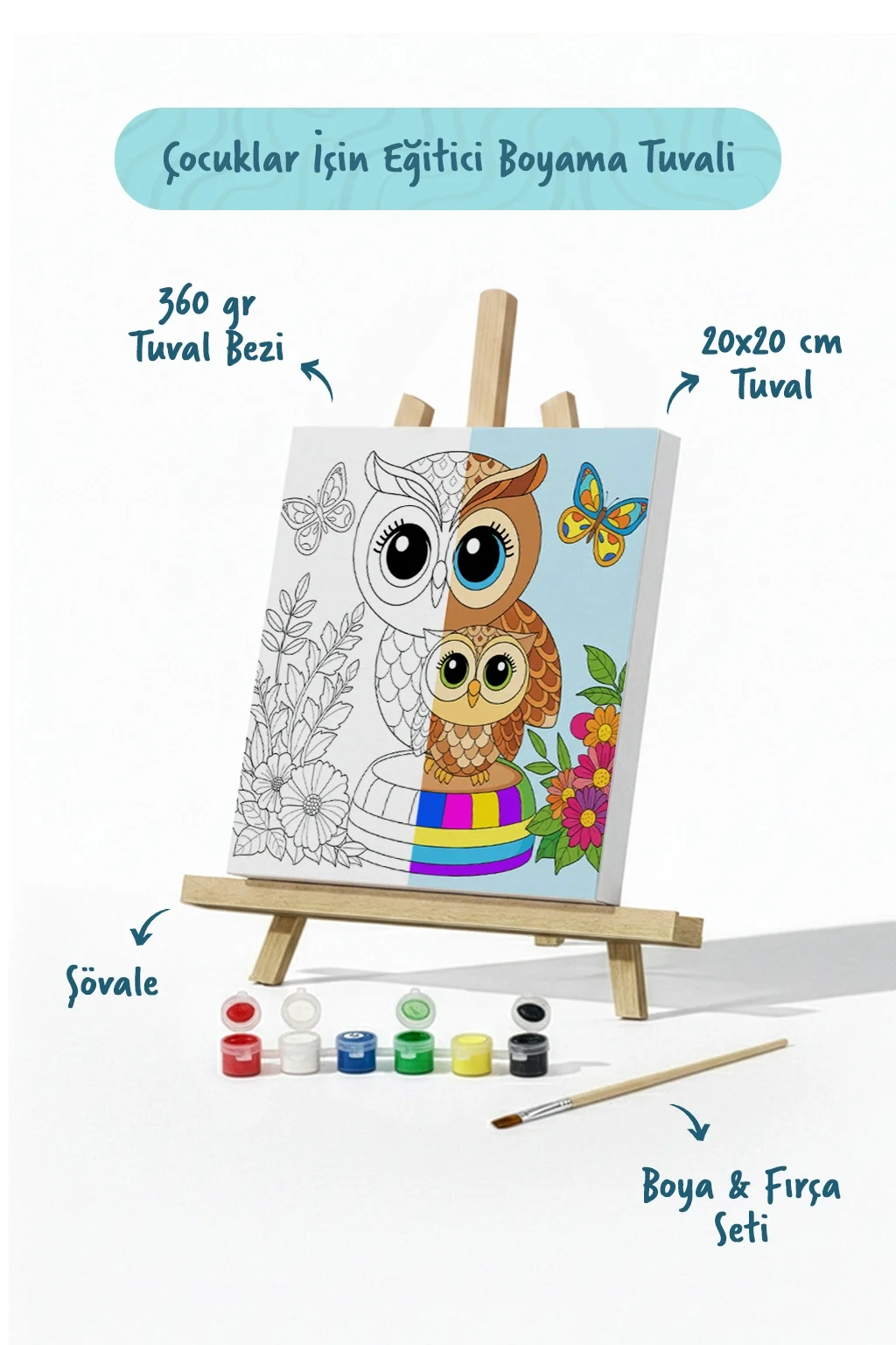 Sevimli Baykuş Temalı Çocuk Boyama Tuvali – Şövaleli Eğitici Boyama Seti 20x20 cm