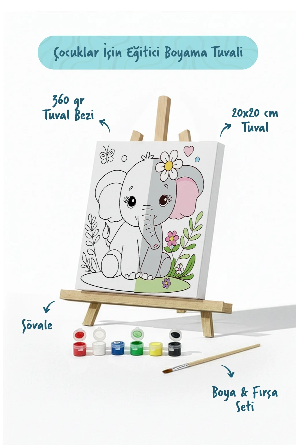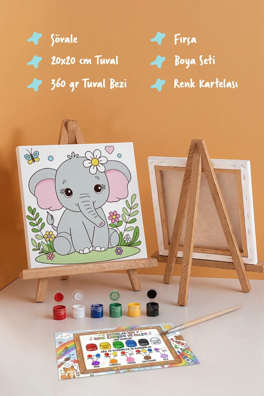Sevimli Fil Temalı Çocuk Boyama Tuvali – Şövaleli Eğitici Boyama Seti 20x20 cm