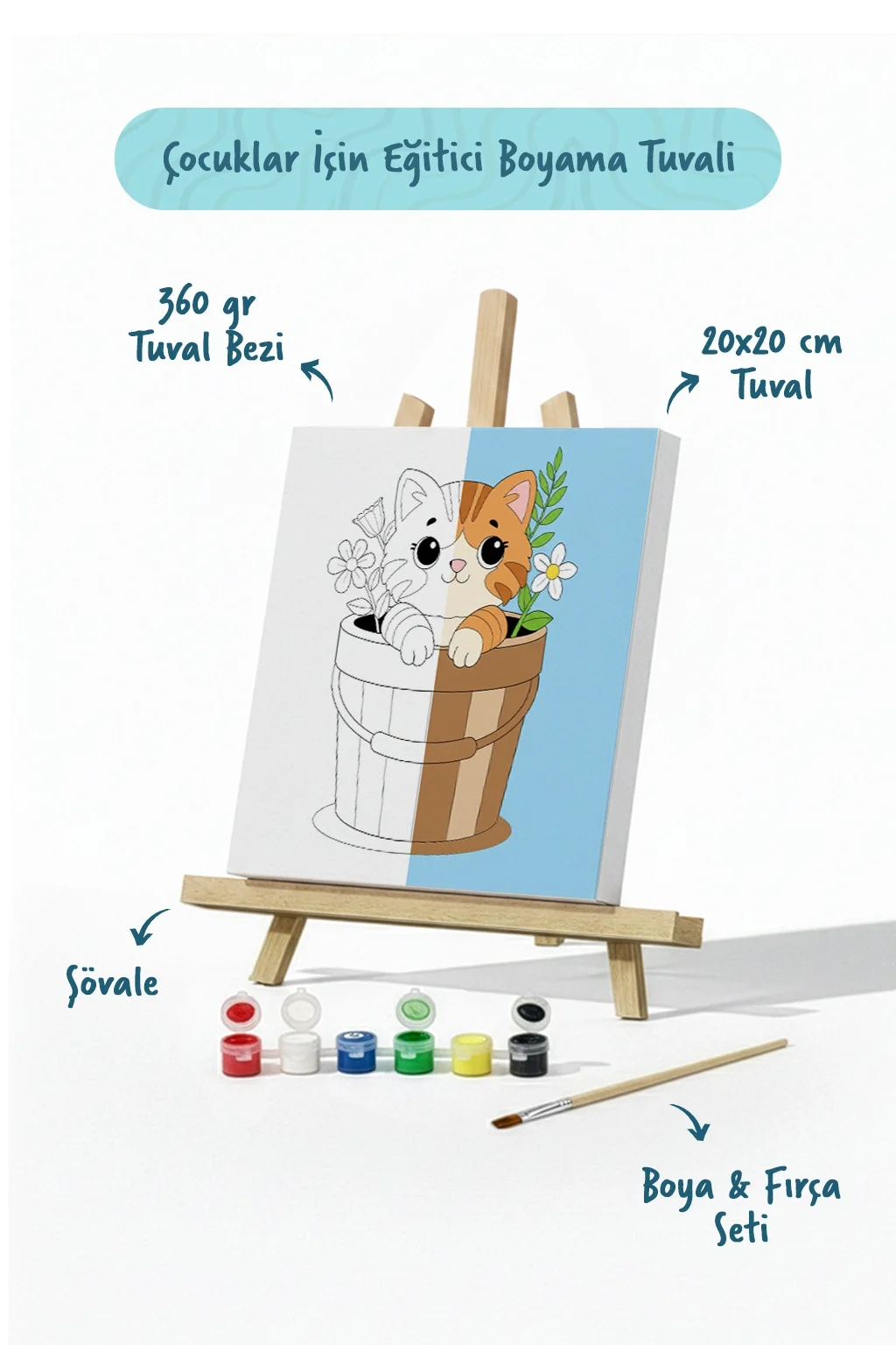 Sevimli Kedi Temalı Çocuk Boyama Tuvali – Şövaleli Eğitici Boyama Seti 20x20 cm