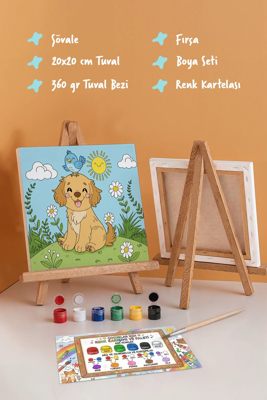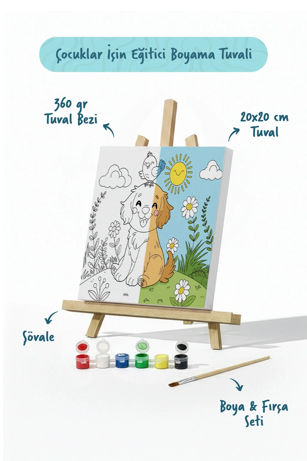 Sevimli Köpek ve Kuş Temalı Çocuk Boyama Tuvali – Şövaleli Eğitici Boyama Seti 20x20 cm