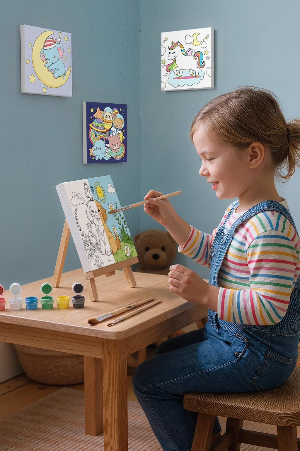 Çocukların yaratıcılığını geliştirmek ve sanatla eğlenceli vakit geçirmelerini sağlamak için tasarlanan çocuk boyama tuvali, sevimli köpek ve başındaki küçük kuş figürü ile hazırlanmış neşeli bir tasarıma sahiptir. 20x20 cm ölçülerindeki kaliteli pamuk tuval, mini ahşap şövale, boya seti ve fırça ile birlikte sunularak çocukların gerçek bir ressam deneyimi yaşamasına yardımcı olur.