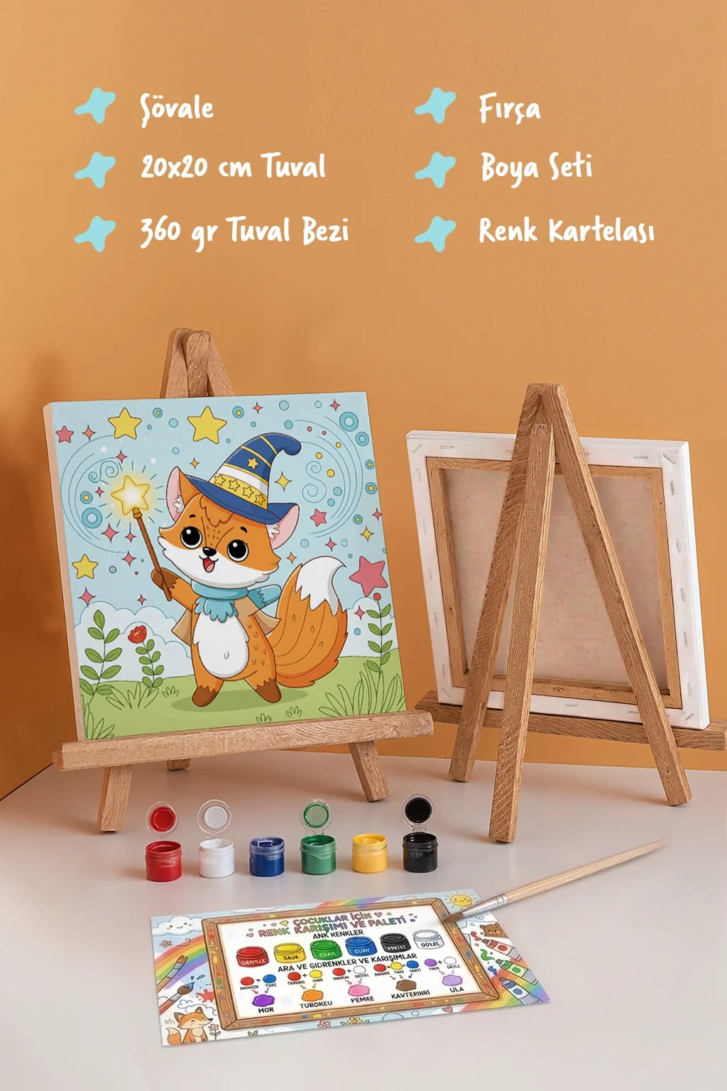 Çocukların hayal gücünü geliştiren çocuk boyama tuvali, sihirli değneği ve yıldızlarla dolu eğlenceli dünyasıyla tasarlanan sevimli tilki figürü ile çocuklara keyifli bir sanat deneyimi sunar. 20x20 cm ölçülerindeki kaliteli pamuk tuval, mini ahşap şövale, boya seti ve fırça ile birlikte gelerek çocukların gerçek bir ressam gibi boyama yapmasına olanak sağlar.