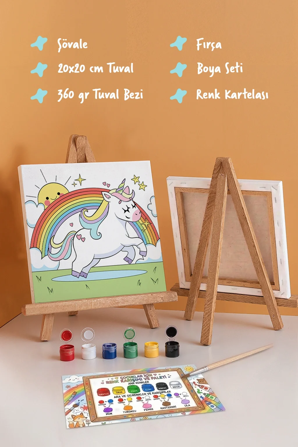 Unicorn & Gökkuşağı Figürlü Çocuk Boyama Tuvali – Şövaleli Boya Seti 20x20