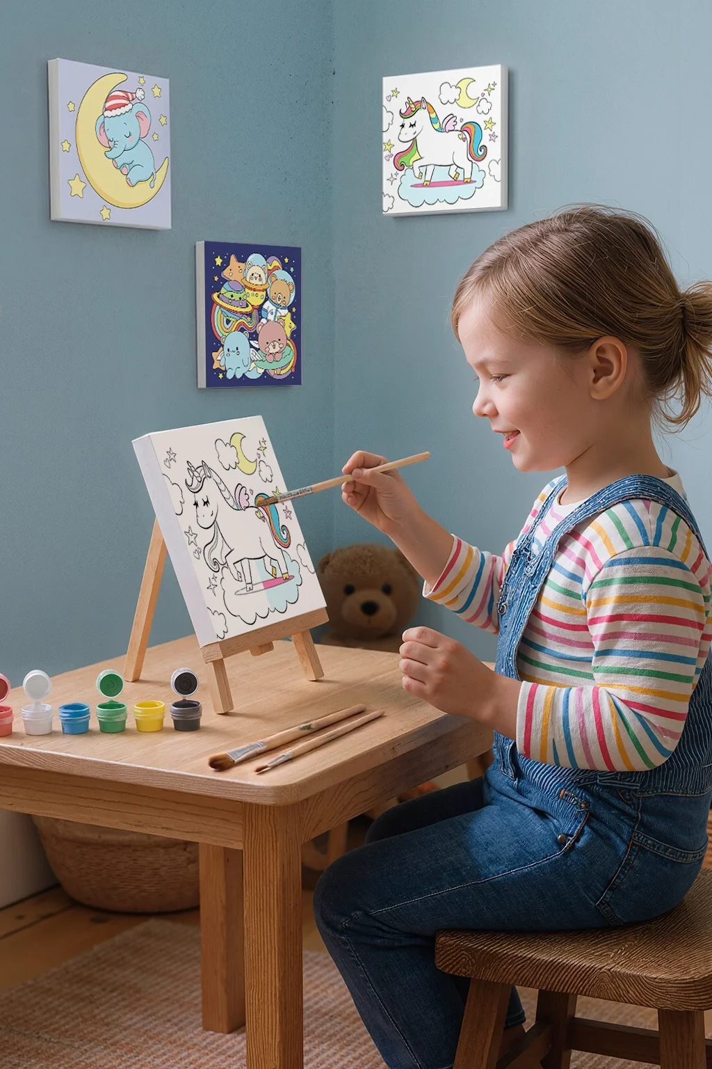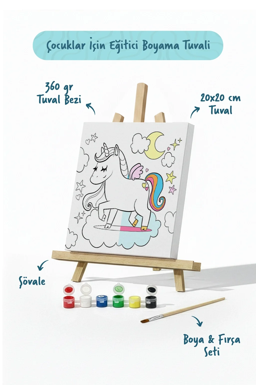 Çocukların hayal gücünü geliştiren çocuk boyama tuvali, eğlenceli unicorn teması ile sanat ve öğrenmeyi bir araya getirir. 20x20 cm ölçülerindeki kaliteli pamuklu tuval üzerinde yer alan sevimli unicorn çizimi, çocukların kendi renk dünyalarını yaratmalarına imkan tanır. Set içerisinde bulunan mini ahşap şövale, boya seti ve fırça sayesinde çocuklar gerçek bir ressam gibi boyama deneyimi yaşayabilir. Eğitici ve eğlenceli yapısıyla çocukların yaratıcılığını destekleyen bu özel şövaleli boyama seti, hem aktivite hem de dekoratif bir sanat çalışması oluşturma fırsatı sunar.