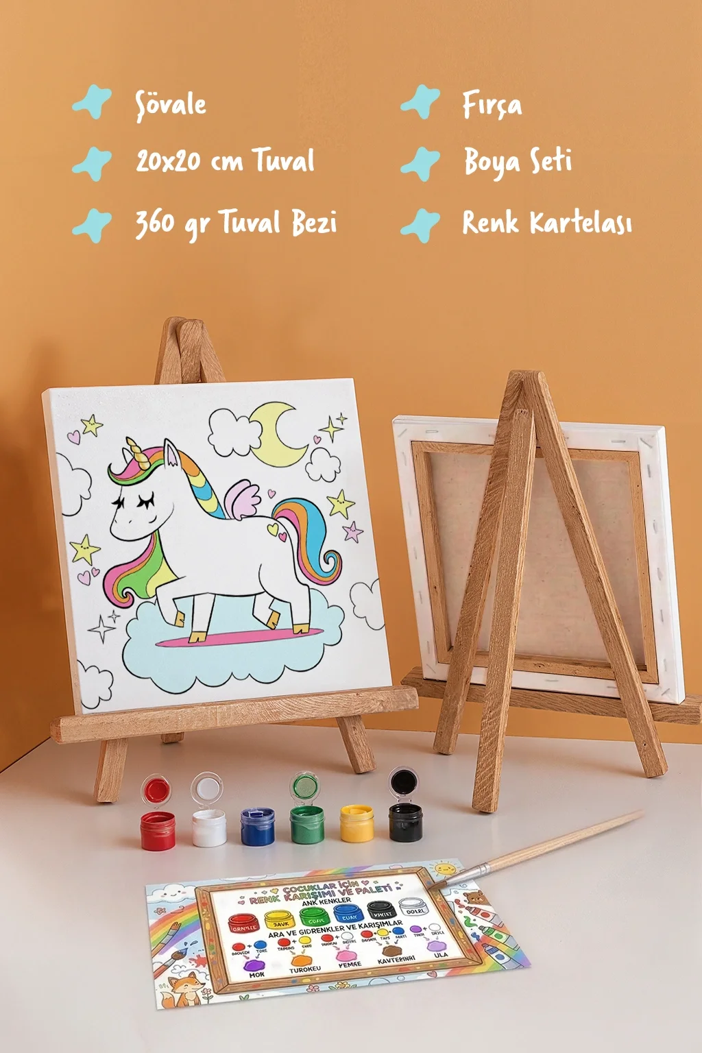 Unicorn Temalı Çocuk Boyama Tuvali Seti – Şövaleli Eğitici Boyama Seti 20x20 cm