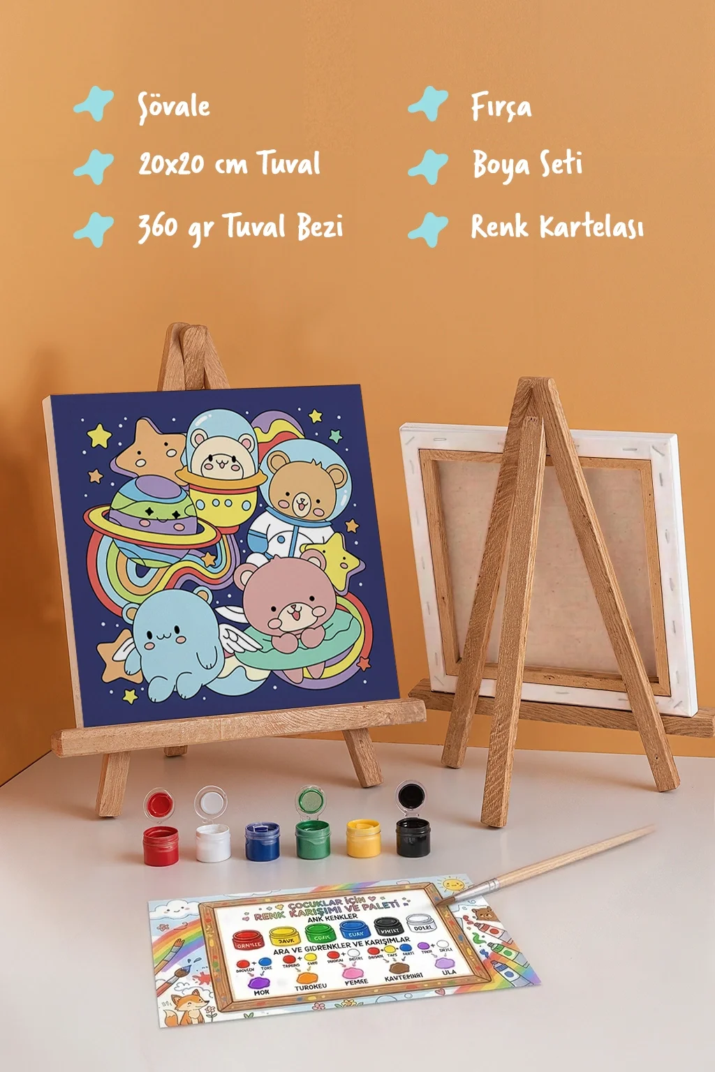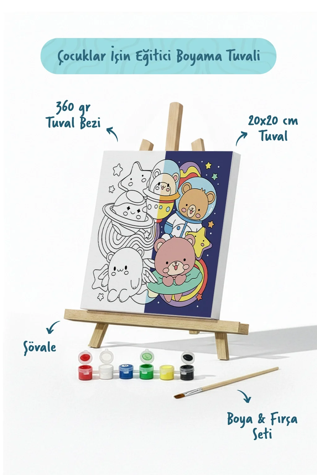 Uzay & Astronot Ayıcık Figürlü Çocuk Boyama Tuvali – Şövaleli Boya Seti 20x20